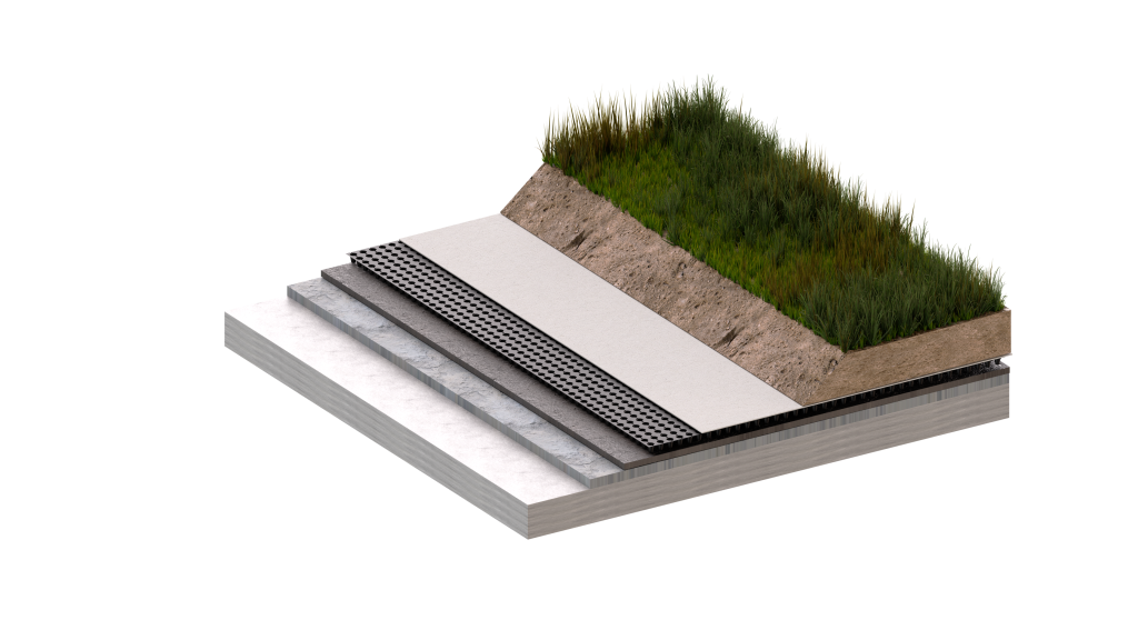 Horizontal eingebaut unterstützt unsere NVG als Drainagebahn die Entwässerung von begrünten Dächern und Terrassenflächen. Auch hier bietet die zusätzliche Gleitschicht Schutz für Abdichtungsbahnen.